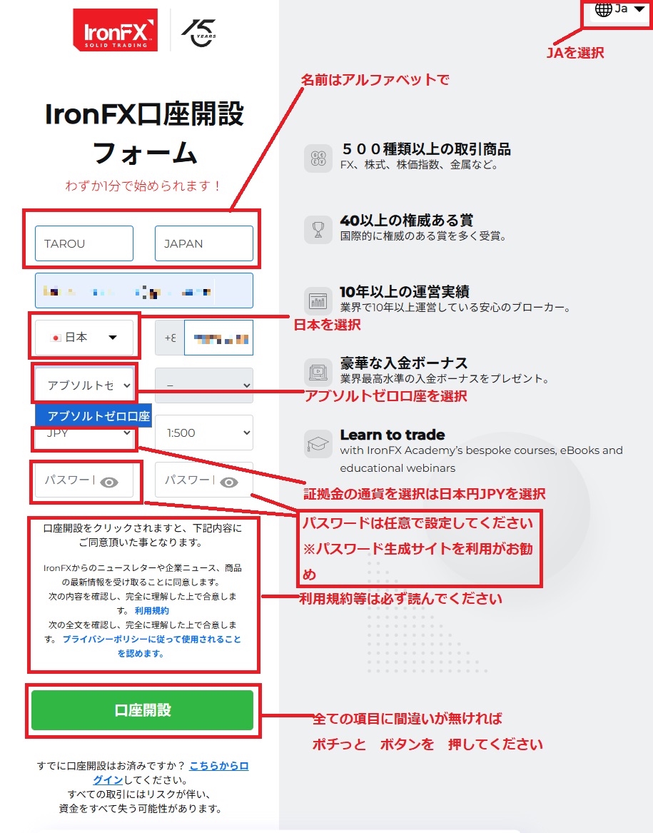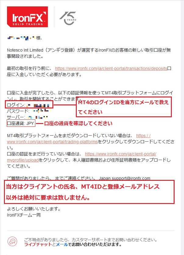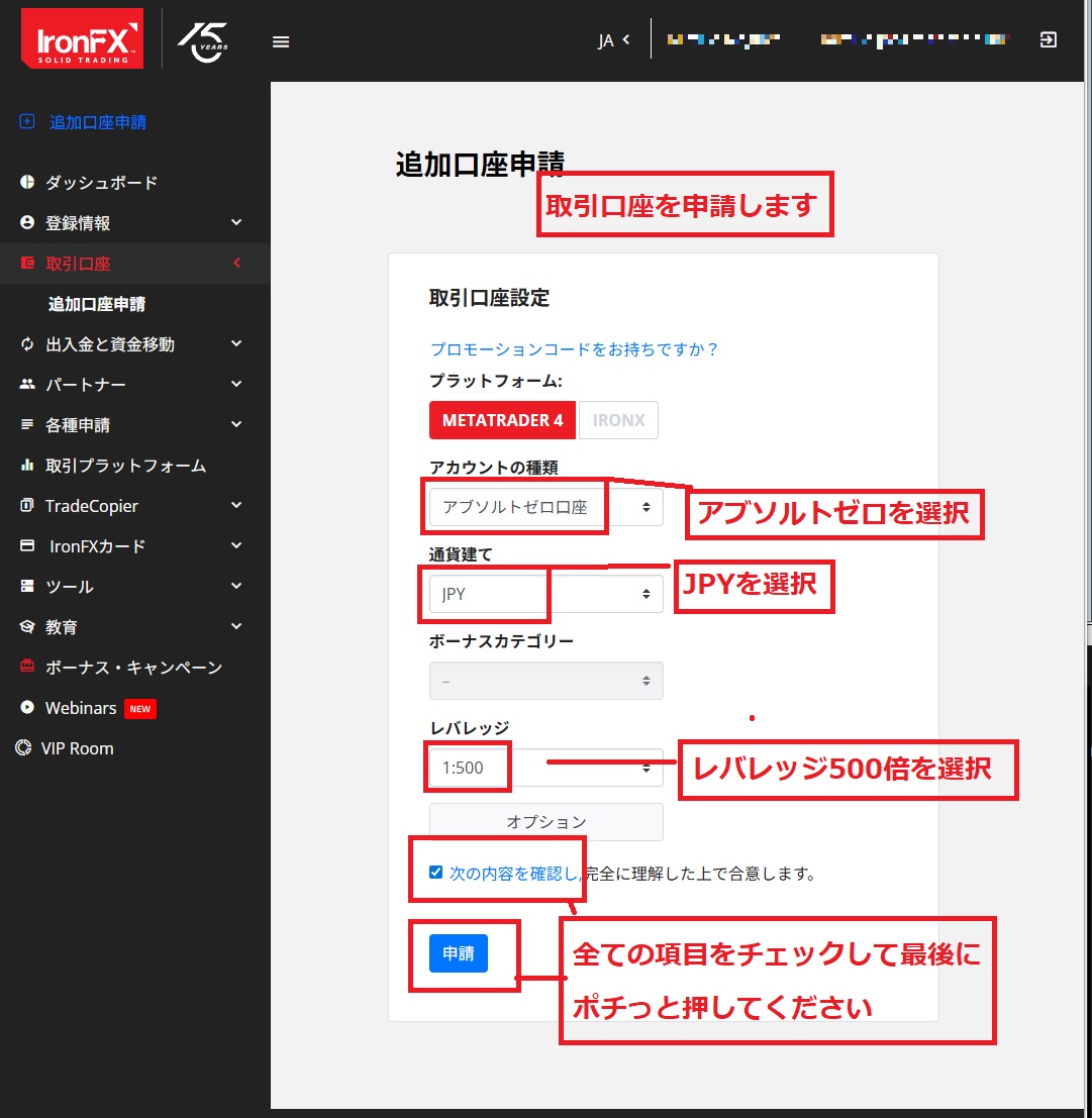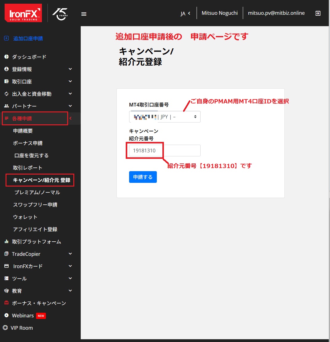IronFX 社との業務提携でシステム運用なので 専用口座開設が必要なので